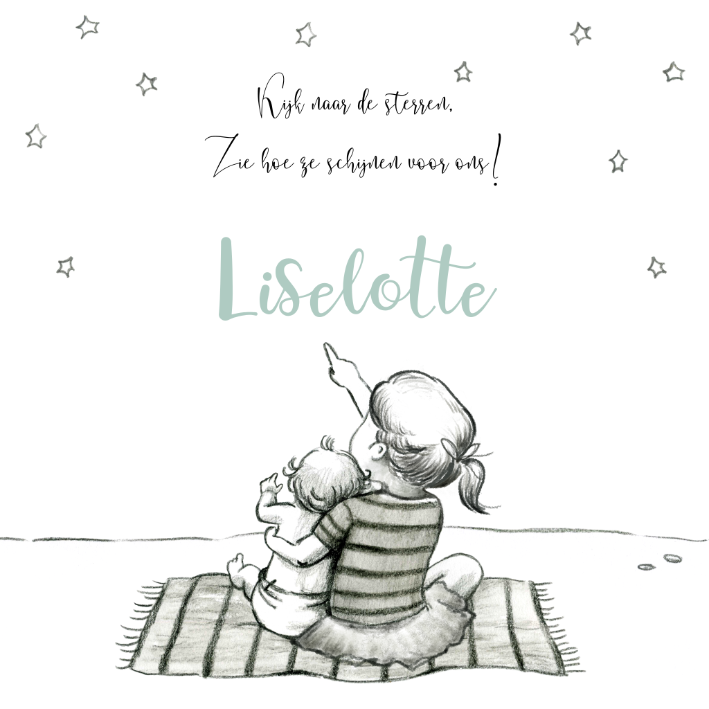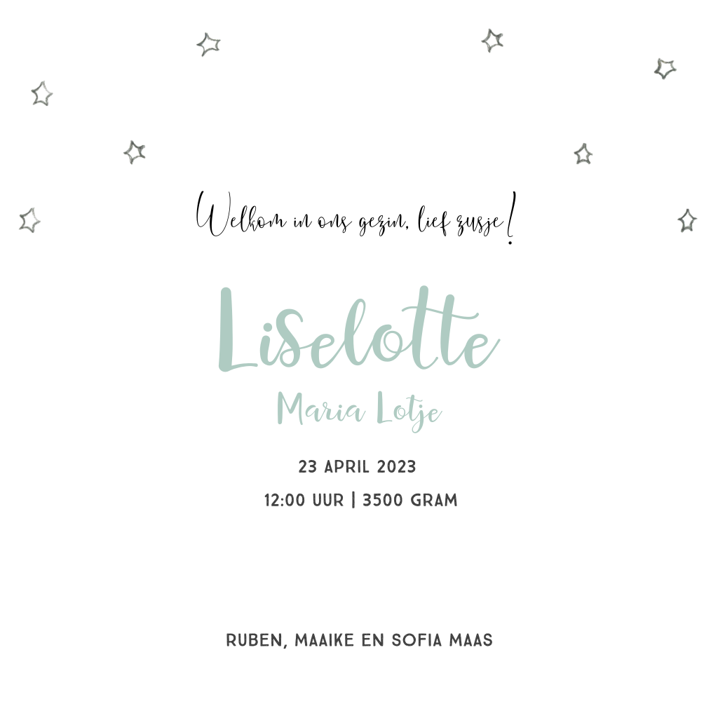 Geboortekaartje zusje met sterren en naam in mintgroen