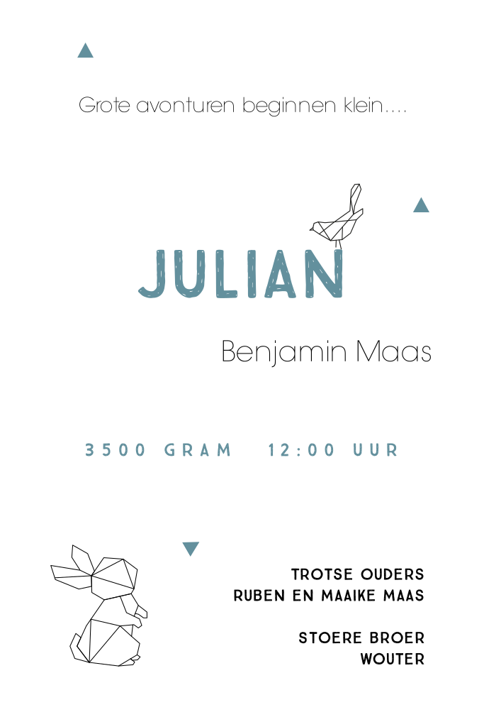 Een zomers geboortekaartje jongen met allemaal diertjes, zoals het vosje, konijntje, vogel en vlindertje. Lief, speels en super hip. Kies bijvoorbeeld voor de papiersoort natuurkarton.