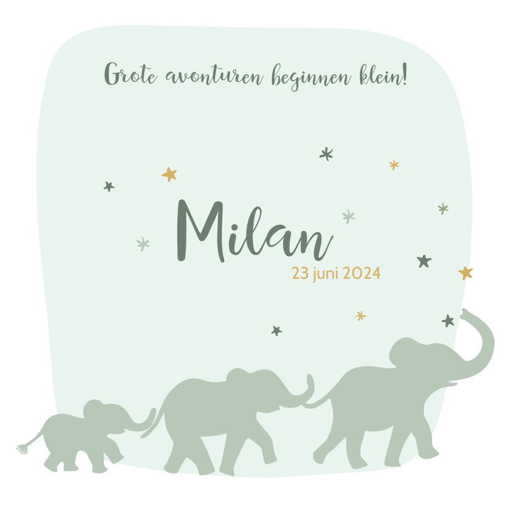 Lief en hip geboortekaartje voor jongen met silhouet van olifantjes