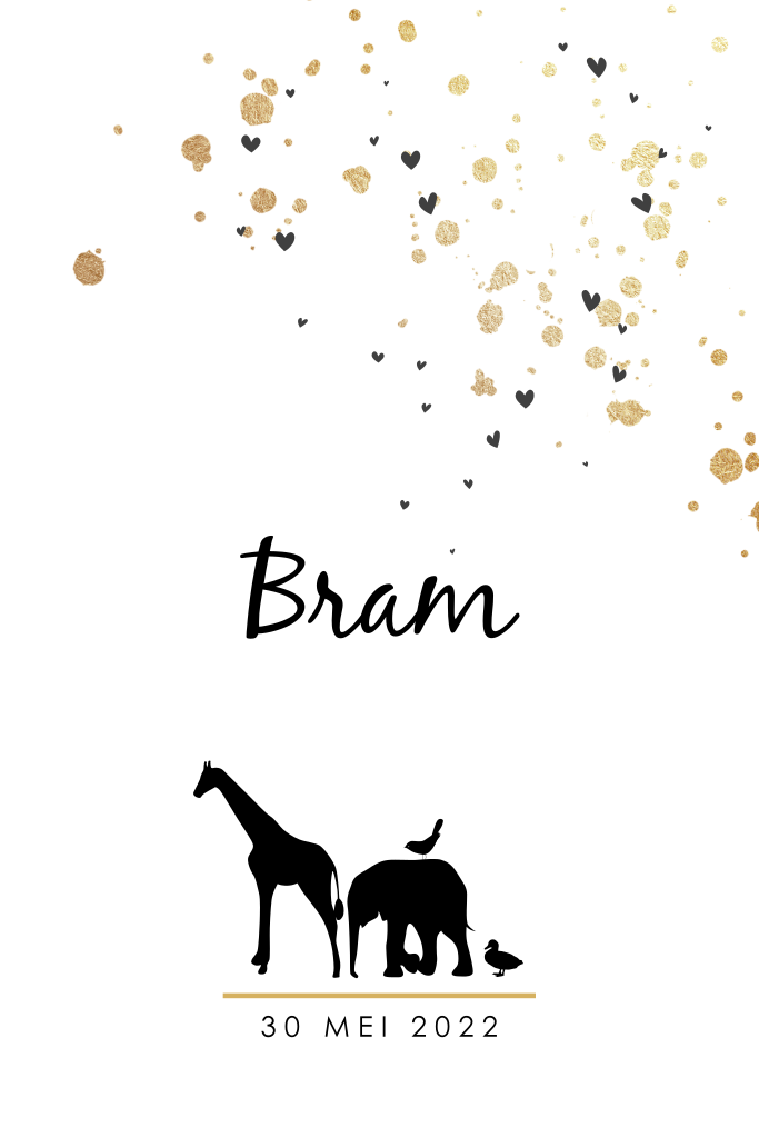 Hoera! Jullie zoon is geboren! Met dit prachtige babykaartje met silhouet van safari dieren met gouden verf laat je iedereen weten dat jullie ventje er is. Hou je van luxe en glamour? Kies dan voor parelmoer papier.