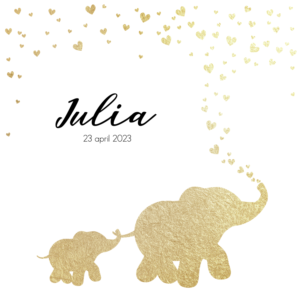 Lief geboortekaartje voor meisje met gouden silhouet van olifanten