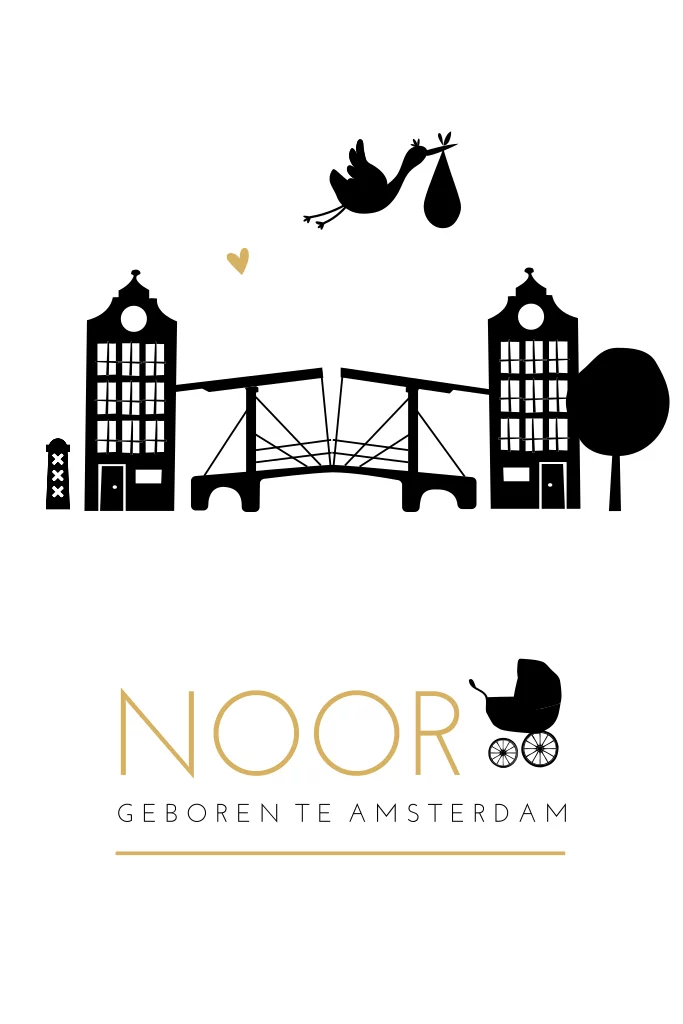 Een hip zwart-wit geboortekaartje meisje met kleine details in goud. De magere Hein en onze typische Hollandse huisjes vormen het decor. Mooi op natuurkarton en te combineren met een gouden envelop.