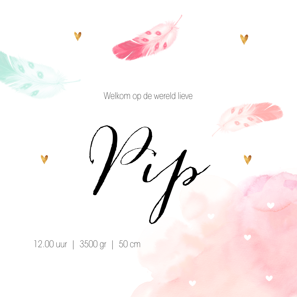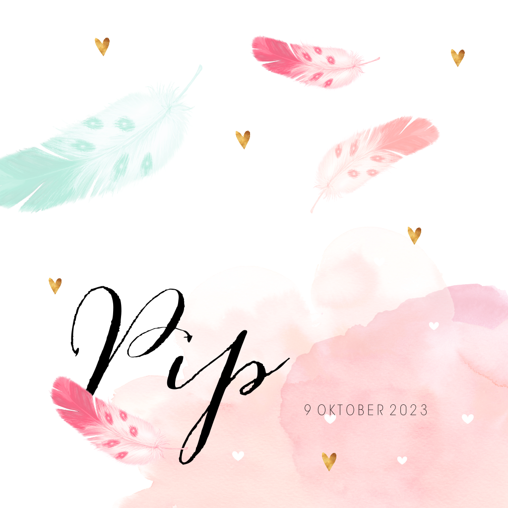 Lief en hip kaartje voor de geboorte van jullie dochter. Prachtige veertjes in roze en mintgroen. Gouden hartjes op watercolour. Lief, hip en romantisch. Mooi op een luxe papiersoort.