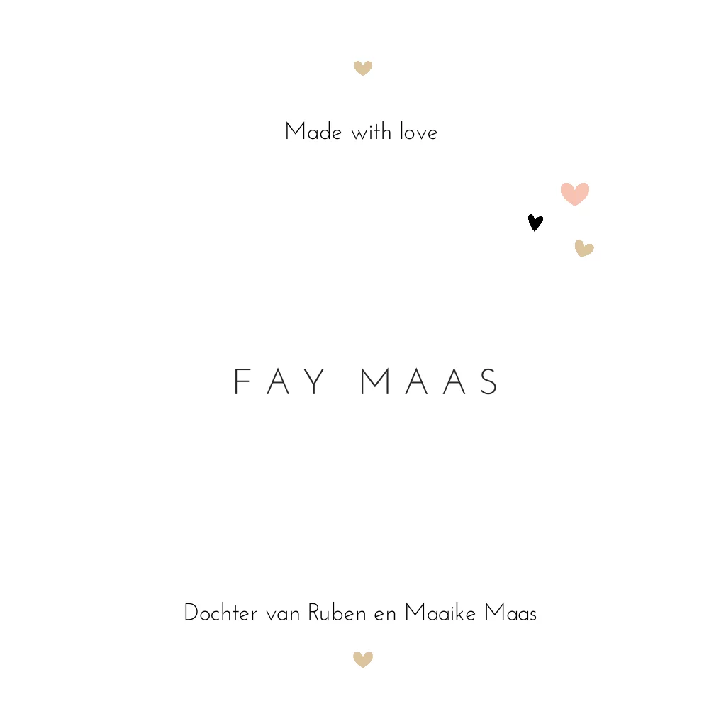 Lief geboortekaartje met veel gekleurde hartjes rondom de naam van jullie kleine meid. En het gave aan deze kaart is dat de naam wordt gedrukt in echt goudfolie. Kies voor een zandkleurige of oudroze envelop en maak het helemaal af met een goudfolie sluitsticker.