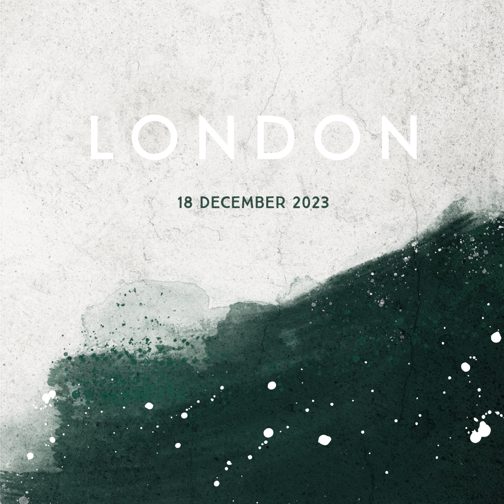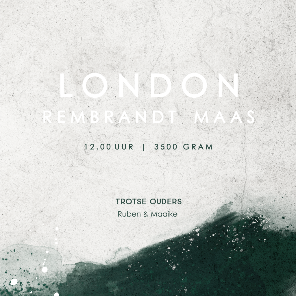 Een dubbel vierkant geboortekaartje zoon met betonlook, verfstrepen in donkergroen en de naam met wat spetters in goudfolie.