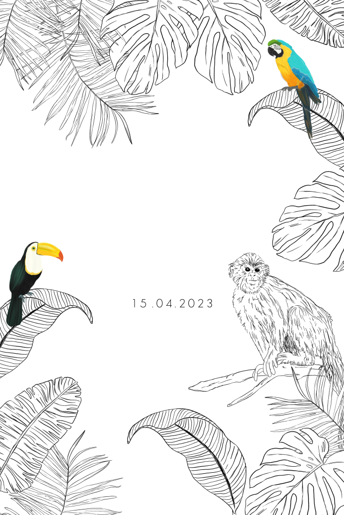 Een avontuurlijk kaartje geboorte jongen in het thema jungle. De basis is de zwart-wit lijntekening met daaraan toegevoegd een kleurrijke toekan en papegaai. En als extra detail de goudfolie. Kies je favoriete lettertype, pas de tekst aan en maak een proefdruk. Vragen? We helpen je graag!