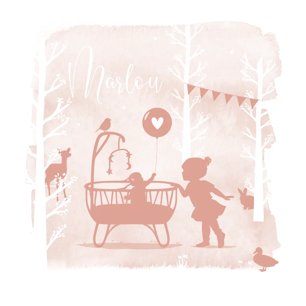 Lief geboortekaartje met goudfolie en silhouetjes van grote zus die haar zusje in de wieg bewondert.