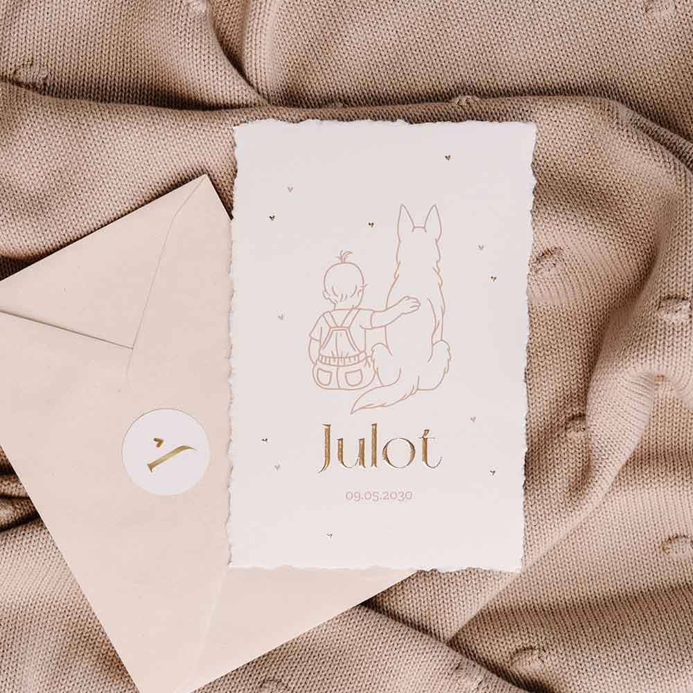 Handgeschept papierlook geboortekaartje met lijntekening en hond