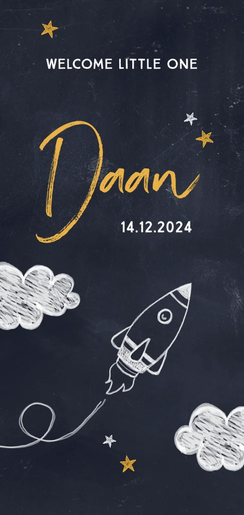 Mooi op krijt dit babykaartje met raket, en wolkjes. Verander eenvoudig de tekst en gebruik je favoriete kleur. Zo maak je in een handomdraai een persoonlijk kaartje.