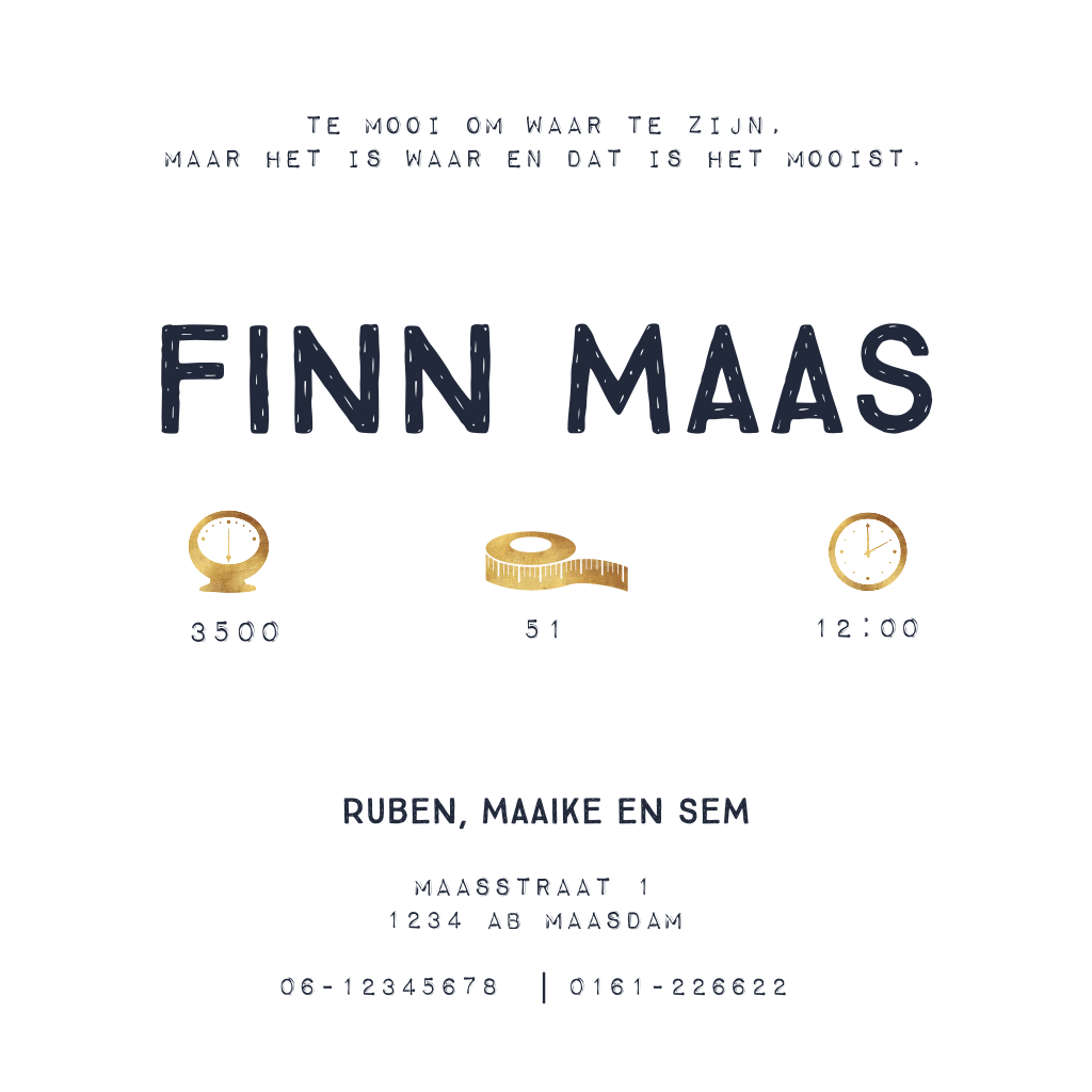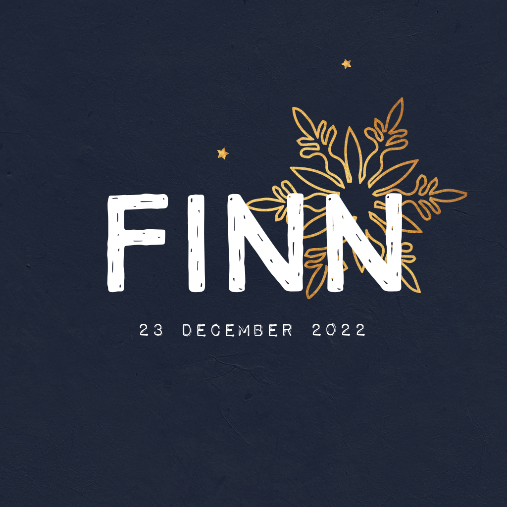 Stoer geboortekaartje met donkerblauwe achtergrond, waar een grote gouden sneeuwster op schittert. In de binnenkant van de kaart is ruimte voor een eigen foto. Super gaaf om deze kaart te drukken op natuurkarton en te combineren met een gouden envelop.