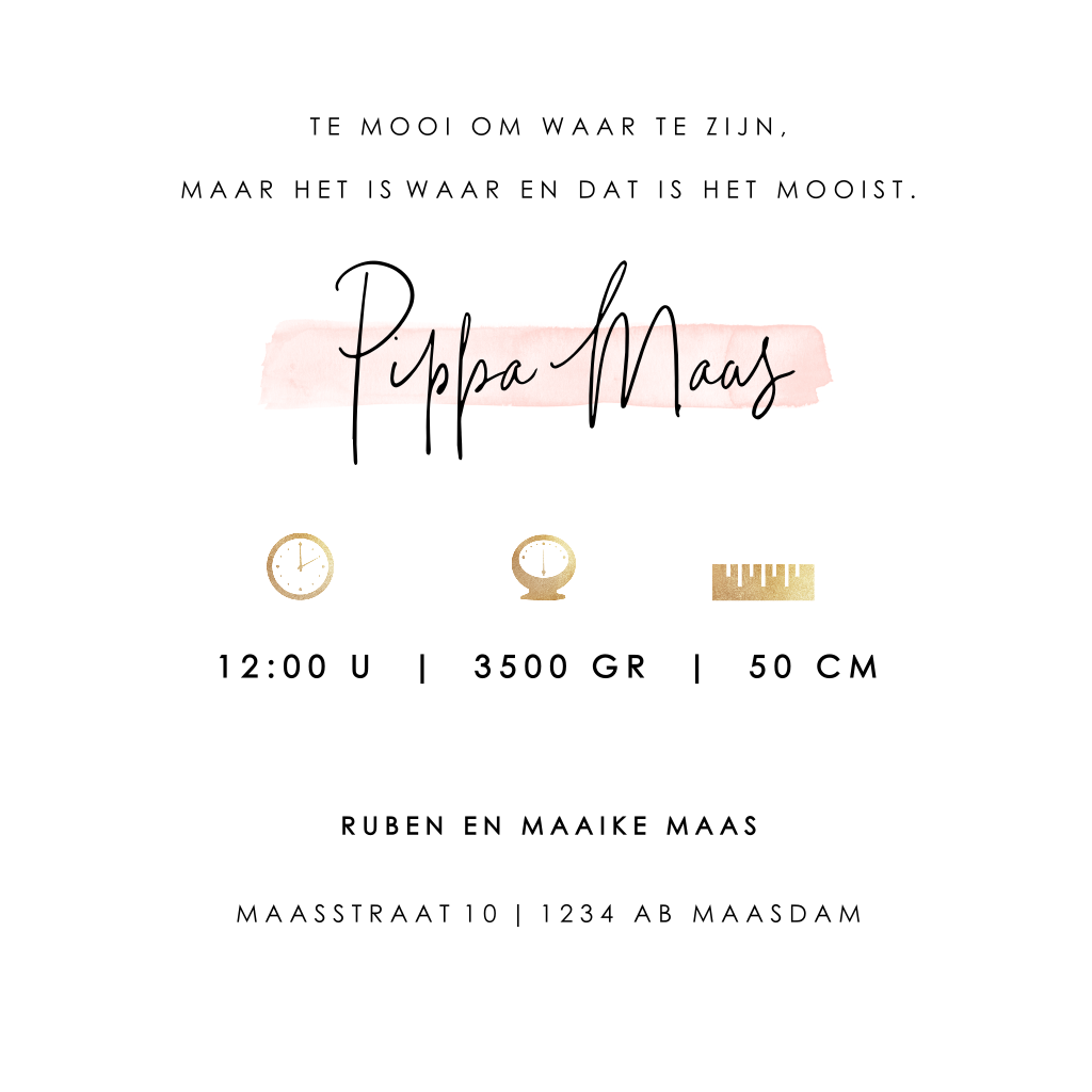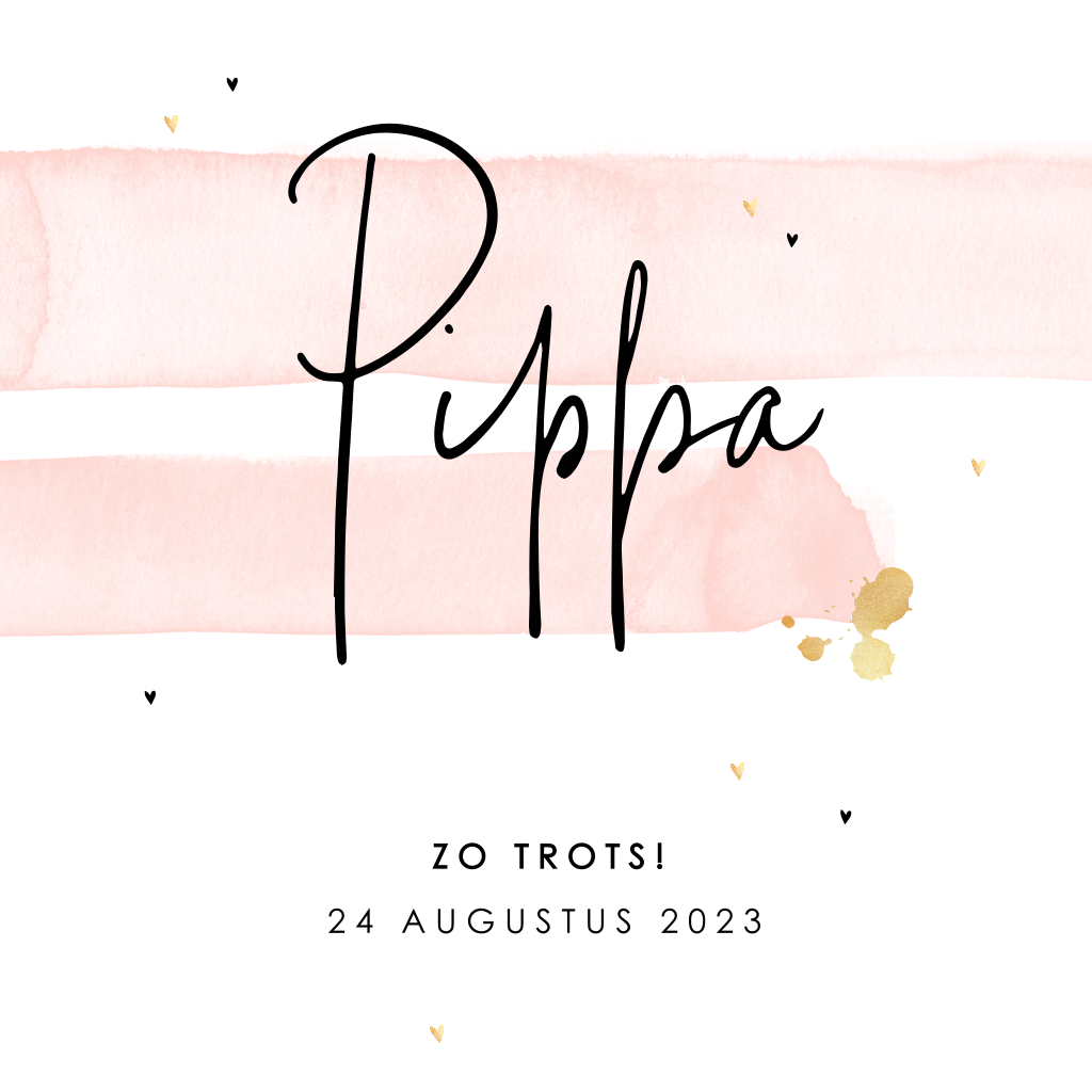 Hip geboortekaartje meisje met watercolour roze en goudlook spetters
