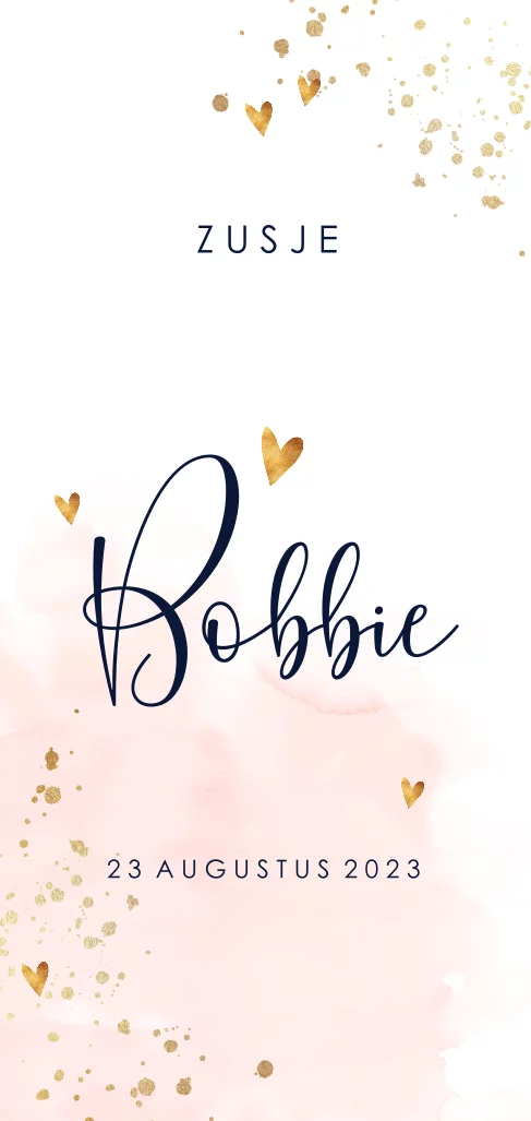Wat een hip en lief geboortekaartje om de komst van een tweede meisje te vertellen. In prachtig donkerblauw met gouden hartjes en spetters. Super gaaf om deze kaart te drukken op yvory gold en te combineren met een peach of roze envelop.