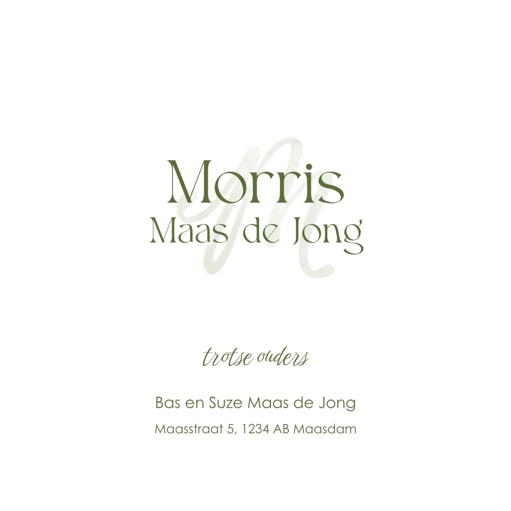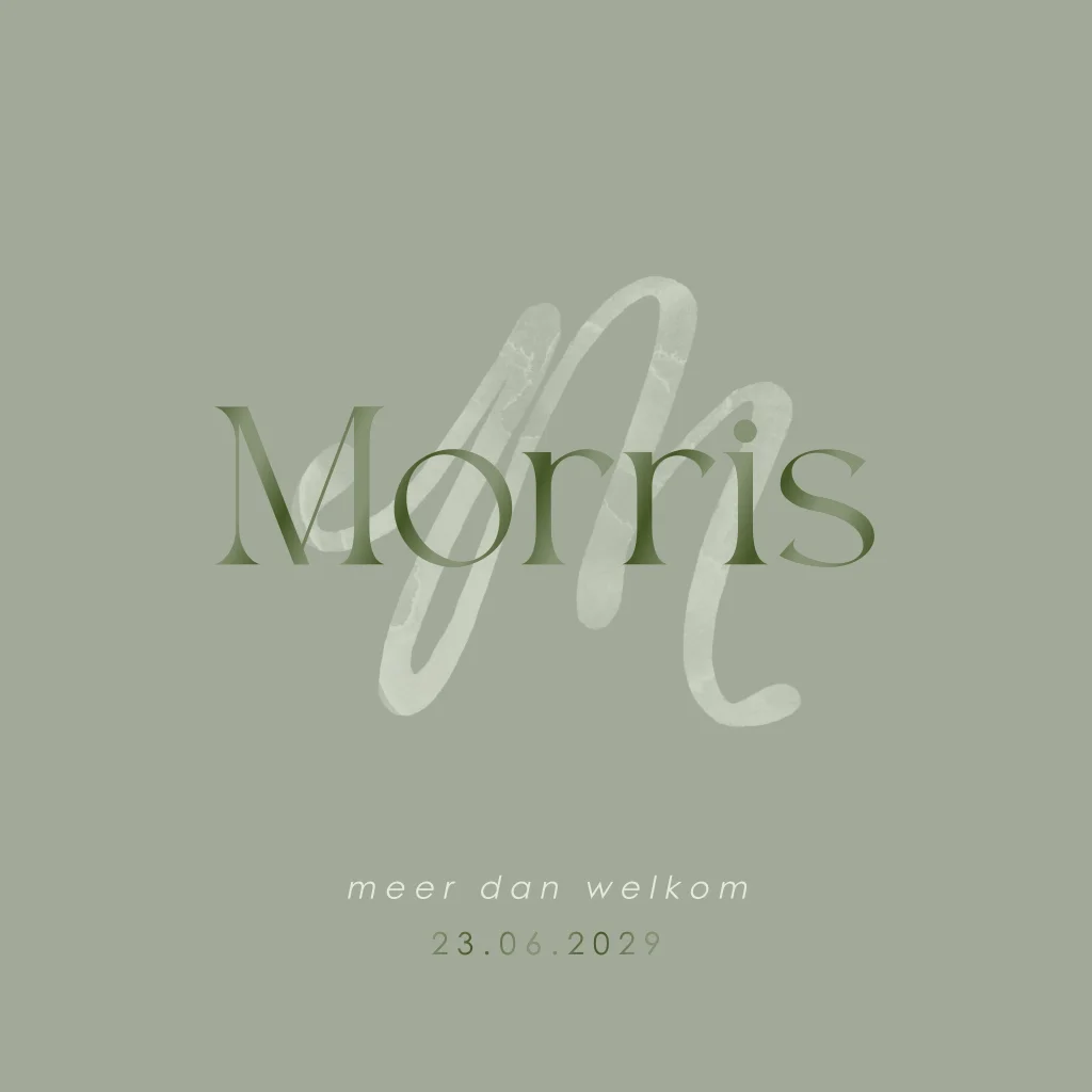 Een prachtig geboortekaartje voor een jongen. De groene achtergrond combineert mooi met de letters in donkergroene hoogglans. Pas helemaal naar eigen wens in in de online editor.