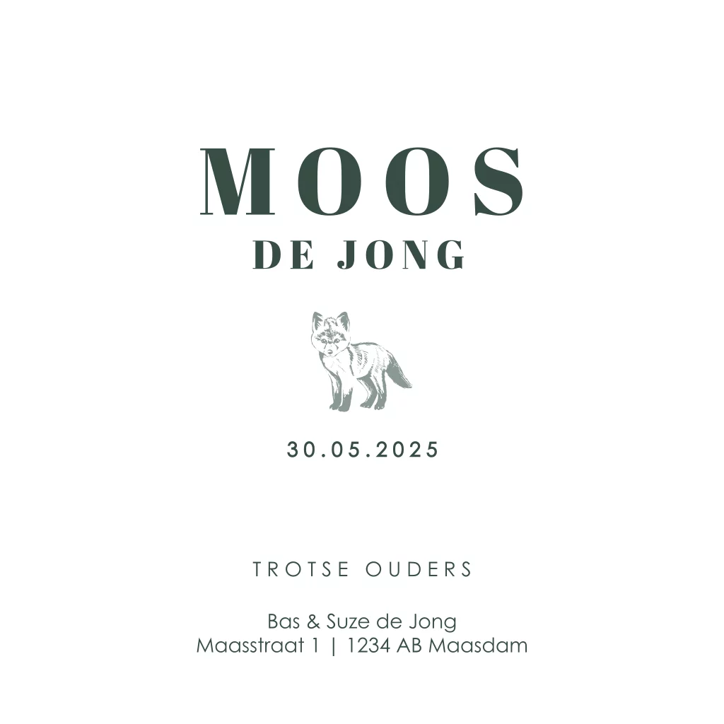 Een stijlvol geboortekaartje voor een jongetje met vosje. Zo mooi! Pak het kaartje op en bewerk in de editor. Wij hebben gekozen voor petrol tinten, liever andere kleuren? Dit kun je heel gemakkelijk zelf aanpassen!
