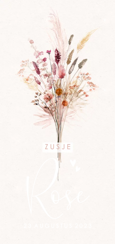 Een prachtig tijdloos design babykaartje dochter met droogbloemen. Op beide zijden hebben we gewerkt met roségoudfolie voor een extra luxe uitstraling.