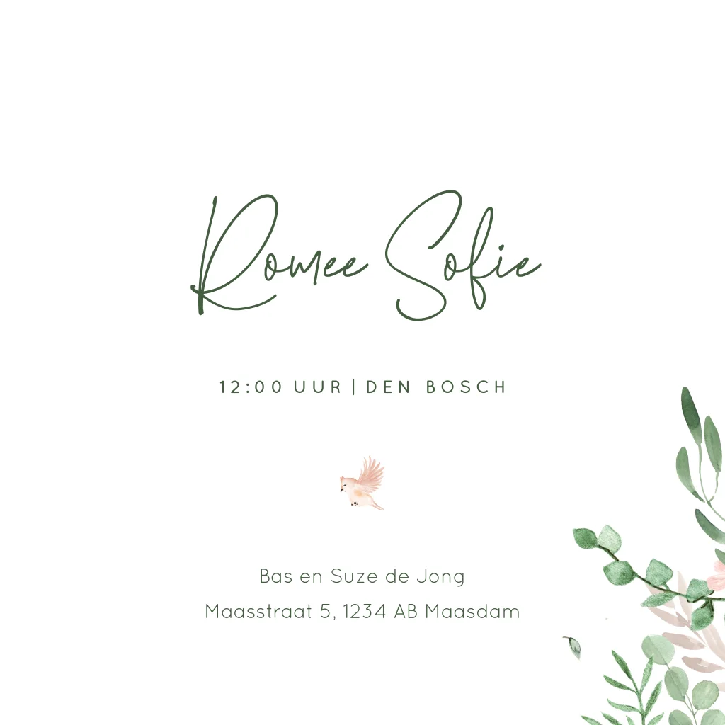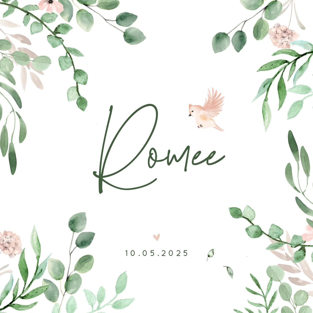 Een geboortekaartje volgens de laatste trends. Botanische elementen zijn niet meer weg te denken uit onze collecties, de bloemetjes maken het extra lief en zacht.