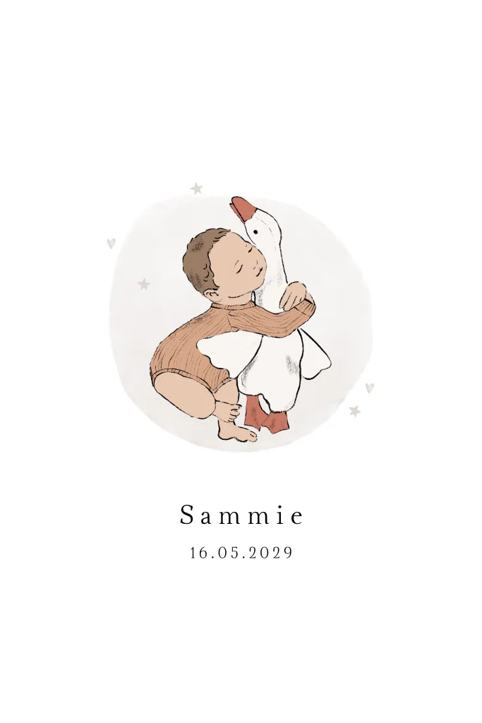 Een lief kaartje voor de geboorte van jullie kleintje. Het kaartje heeft een minimalistisch design met een vintage afbeelding van een slapende baby met een lieve knuffelgans. De kleine hartjes en sterretjes maken het extra schattig. Pas tekst en kleuren eenvoudig aan in de online editor.