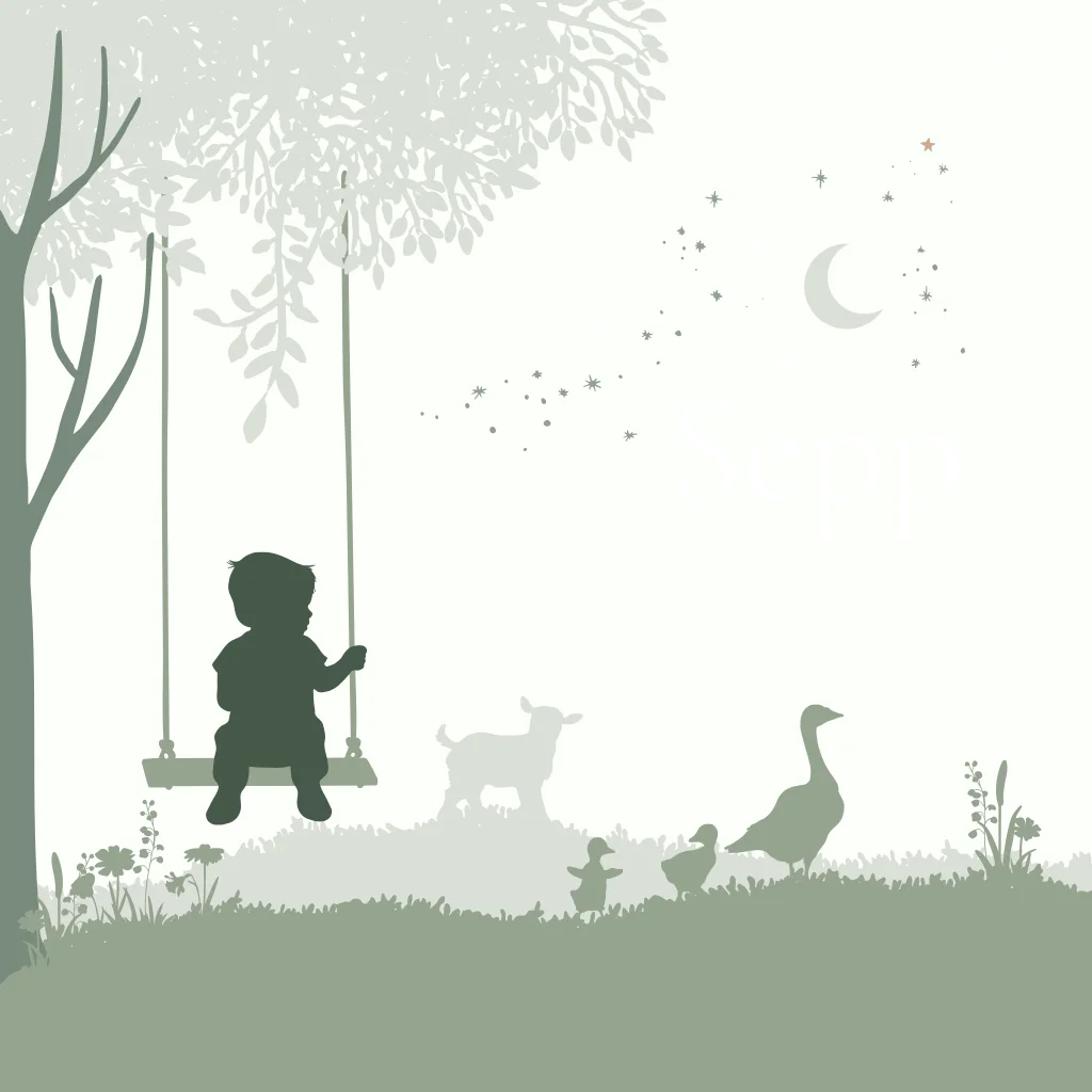 Lief geboortekaartje jongen op schommel mer diertjes en goudfolie