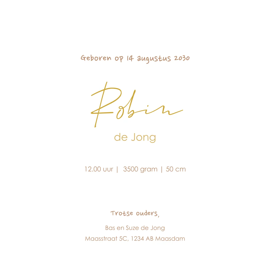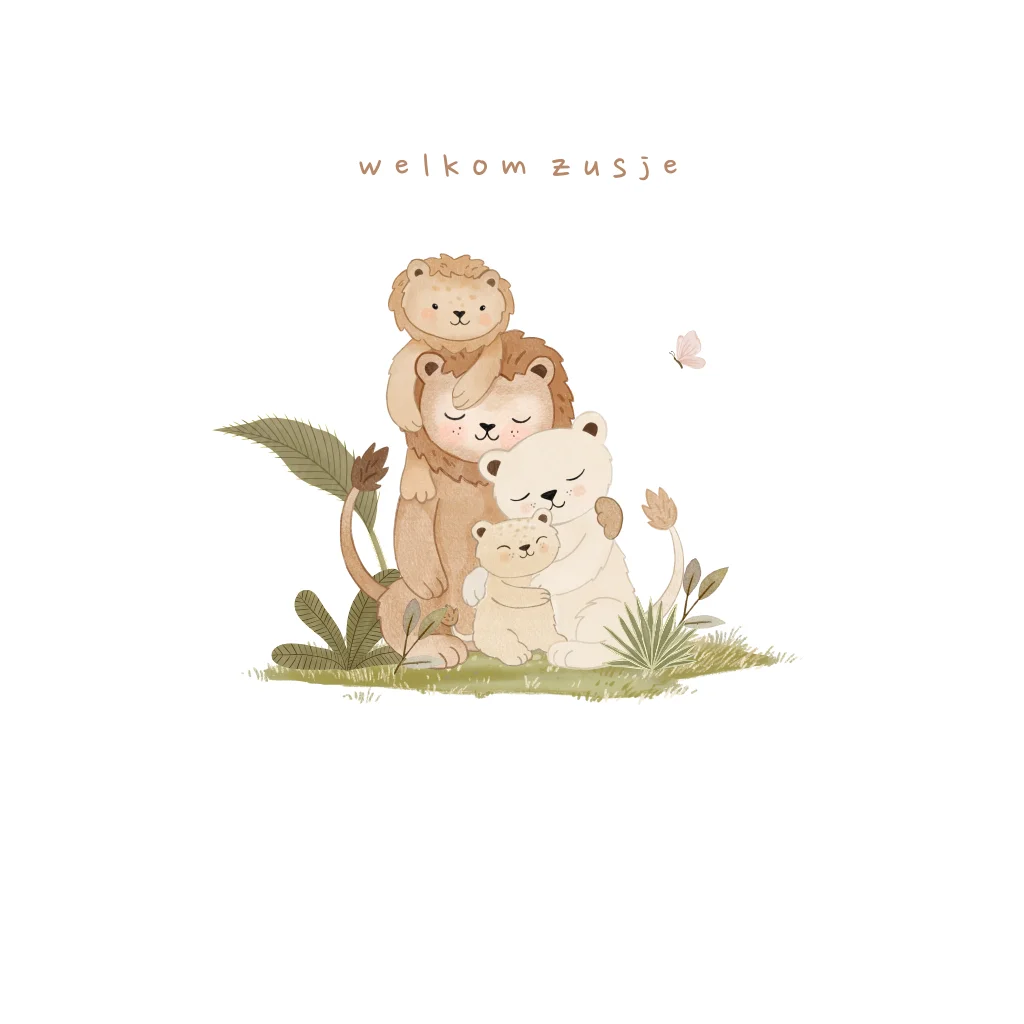 Een prachtig kaartje voor de geboorte van jullie zoontje. Het kaartje heeft een witte achtergrond met daarop een lieve leeuwenfamilie. De naam in mat goudfolie maakt het helemaal af!