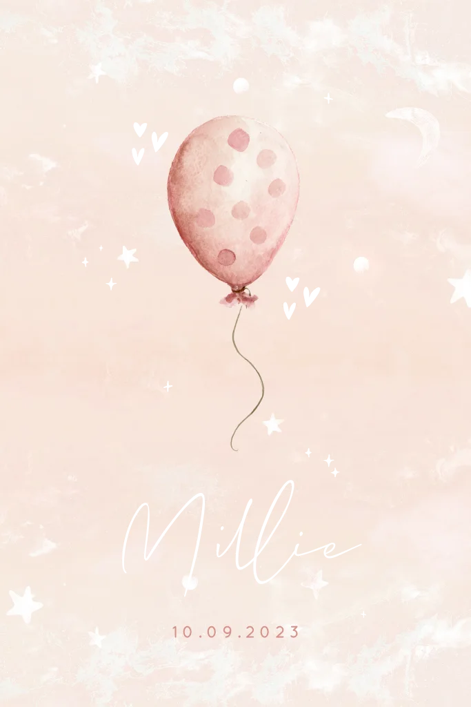 Dit lieve geboortekaartje met ballon en hartjes komt uit onze unieke Poespas collectie, wat bekend staat om haar onwijs stijlvolle, romantische en avontuurlijke behangetjes. De roségoudfolie maakt het kaartje extra bijzonder!