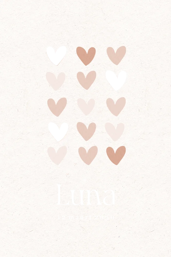 Wat een lief geboortekaartje voor je kleine meisje! Het kaartje heeft zachte kleuren met daarop kleine hartjes. De naam van je kleintje en details staan in mat goudfolie voor een luxe finish. Liever een andere kleur? Pas de kaart eenvoudig naar wens aan in de online editor.