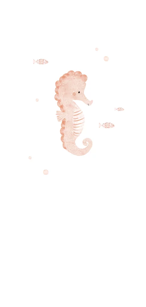 Een prachtig geboortekaartje met een peach zeepaardje en visjes. De roségoudfolie elementen zoals de naam en de hartjes maken dit kaartje extra schattig.