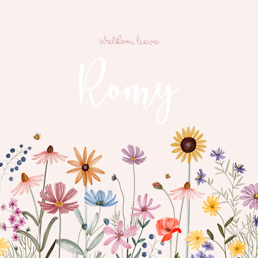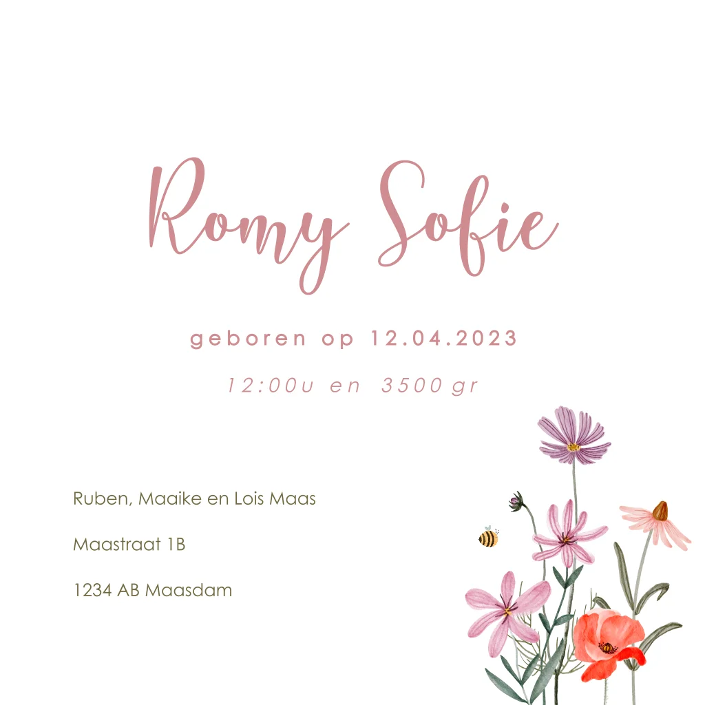 Lief geboortekaartje meisje met veldbloemen en koperfolie