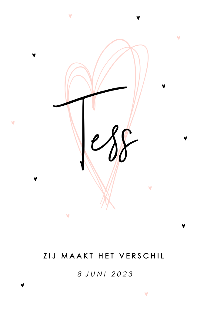 Lief geboortekaartje meisje met hartjes in peach en zwart