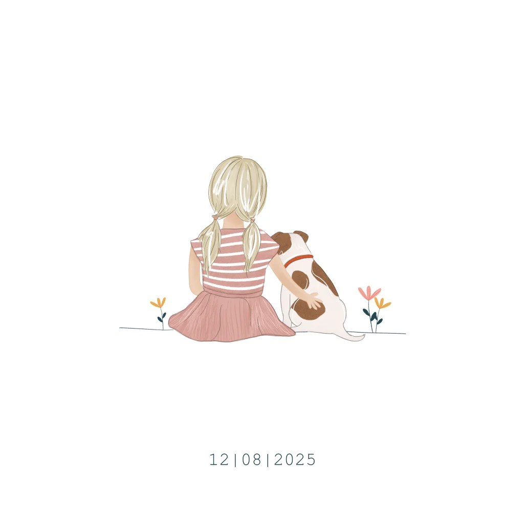 Hoe lief is dit geboortekaartje? Beeld jullie meisje uit met een illustratie van haar en een hondje. Hebben jullie een ander hondje of wil je een ander kapsel voor het meisje? Mail naar de studio, dan kijken we samen naar de mogelijkheden!
