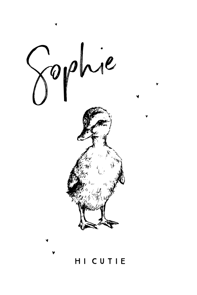 Lief geboortekaartje meisje met little duck in zwart-wit