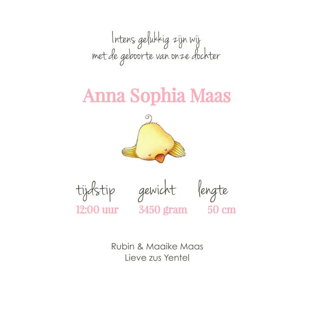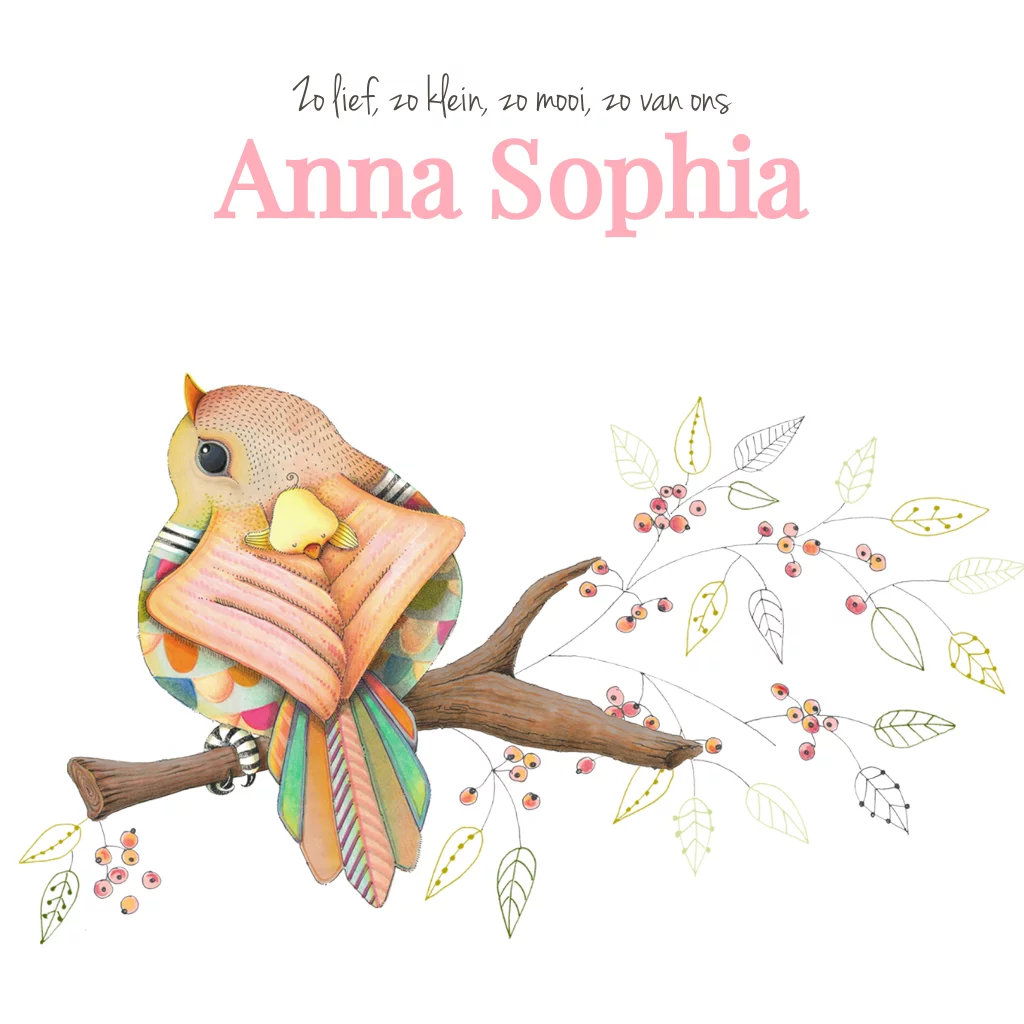Prachtig geïllustreerd dit babykaartje met vogel op tak en een jong vogeltje in de vleugels. Wil je graag dit geboortekaartje in een ander formaat? Laat het ons weten.