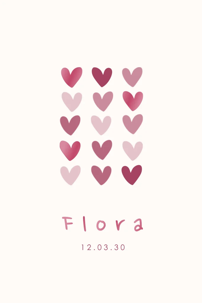 Wat een lief geboortekaartje voor je kleine meisje! Het kaartje heeft mooie roze kleuren met daarop kleine hartjes. De naam van je kleintje en details staan in hoogglans voor een luxe finish. Liever een andere kleur? Pas de kaart eenvoudig naar wens aan in de online editor.