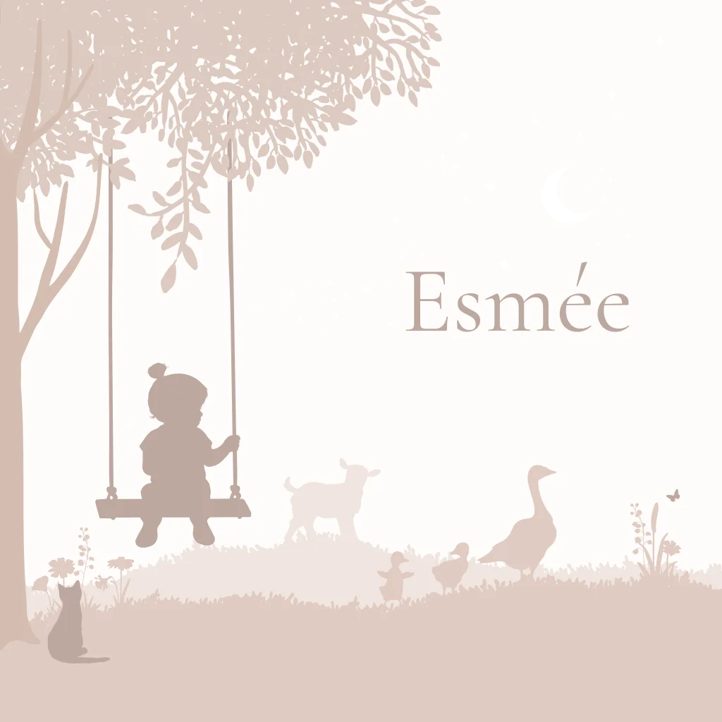 Lief geboortekaartje met meisje op schommel met silhouet en roséfolie
