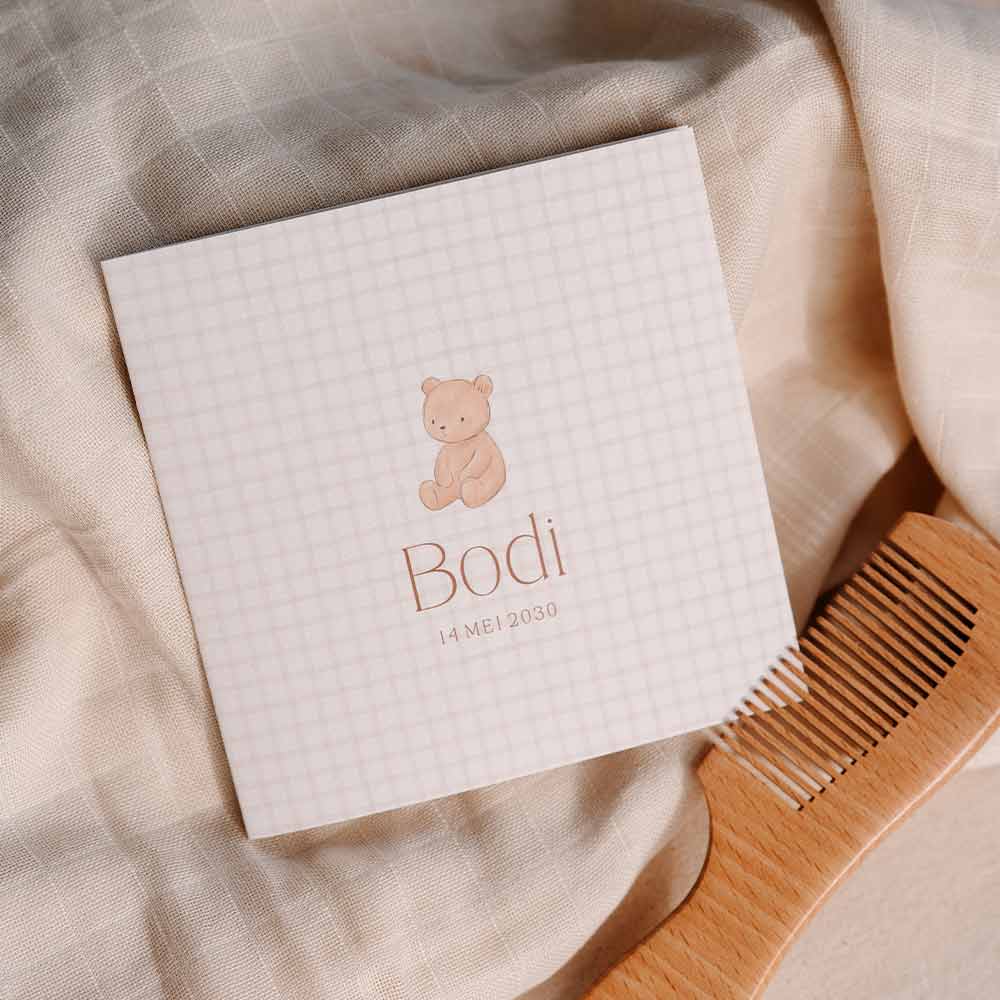 Kondig de geboorte van je kindje aan met dit schattige kaartje met beige ruitjespatroon en lief beertje. Zo zoet!
