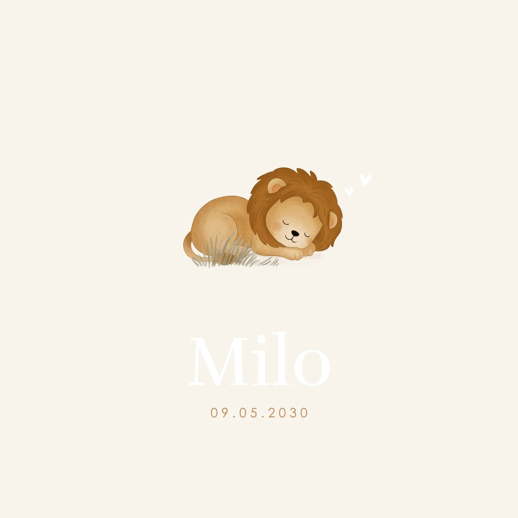 Een lief geboortekaartje voor jullie kindje. Het kaartje heeft een lieve illustratie van een slapend leeuwtje. Het kaartje is verrijkt met mat goudfolie details. Pas het kaartje naar wens zelf aan.
