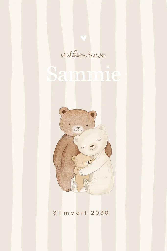 Een lief geboortekaartje om de geboorte van jouw kindje aan te kondigen. Het kaartje heeft beige strepen met een lieve illustratie van een berenfamilie. De naam wordt gedrukt in goudfolie.
