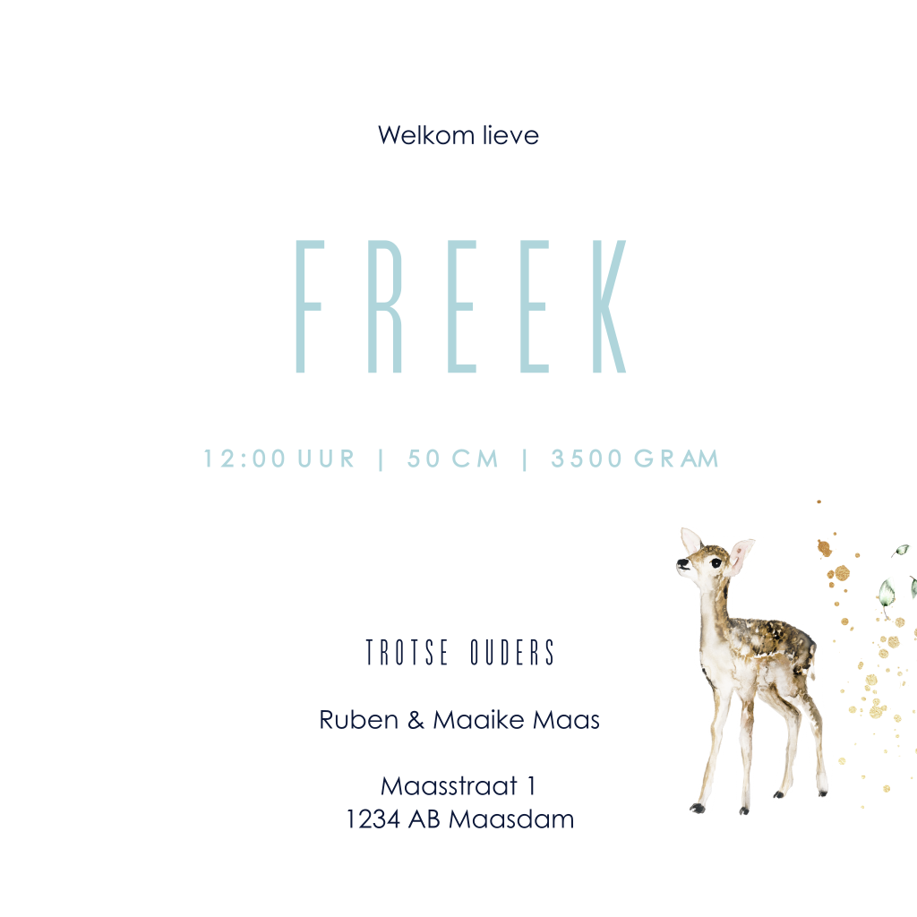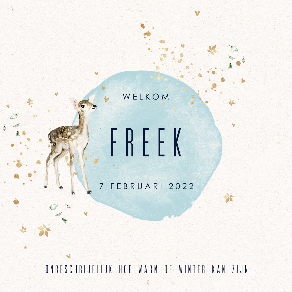 Een lief en trend babykaartje jongen met watercolour en een bambi in aquarel. Stijlvolle typografie en warme kleuren. Maak het kaartje compleet met jullie teksten en een mooie foto van jullie kleine man.