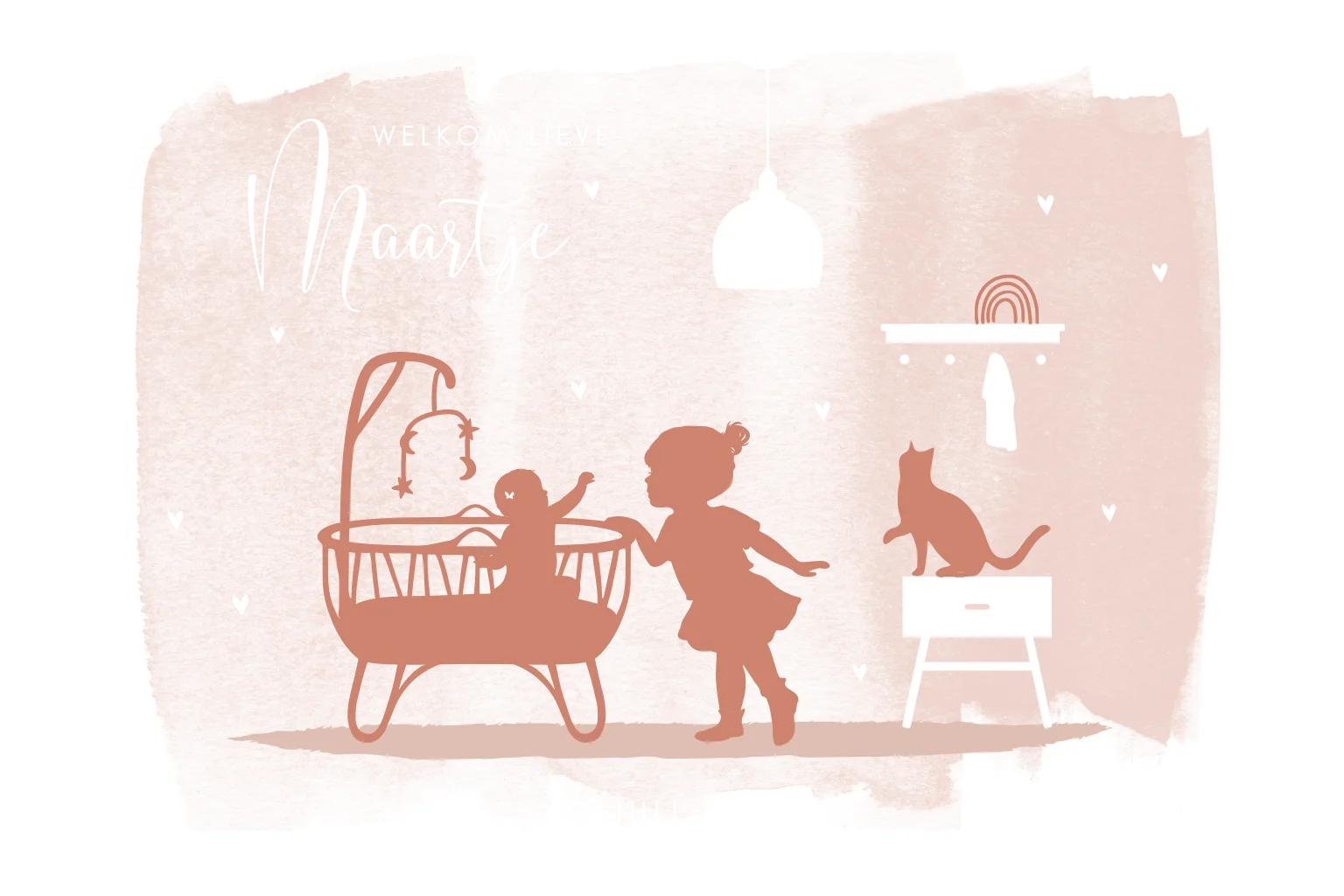 Hoe lief is dit geboortekaartje met silhouetjes in een babykamertje? Kies voor jullie tweede kindje een kaartje met silhouetjes. Is jullie gezinssamenstelling anders? Mail naar de studio, zodat we je verder kunnen helpen met aangepaste silhouetjes.