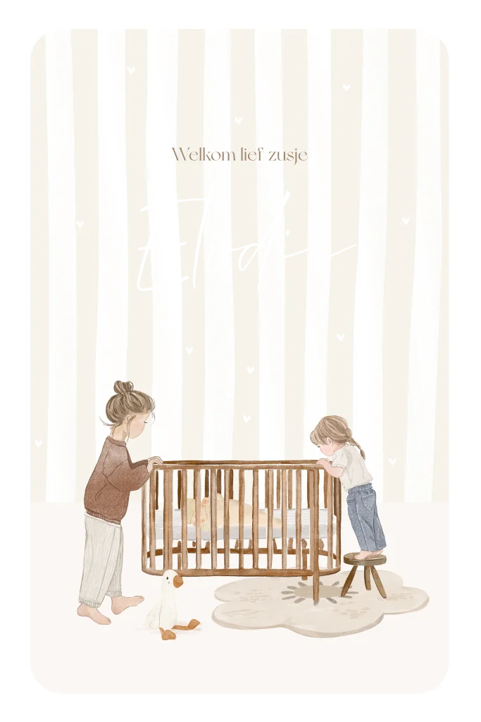 Lief geboortekaartje zusje met beige strepen, wiegje en mat goudfolie