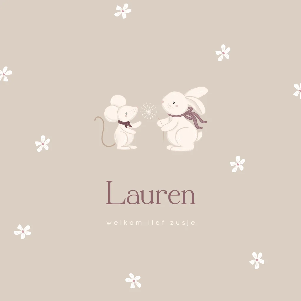 Lief geboortekaartje voor zusje met konijntje, muisje en bloemetjes