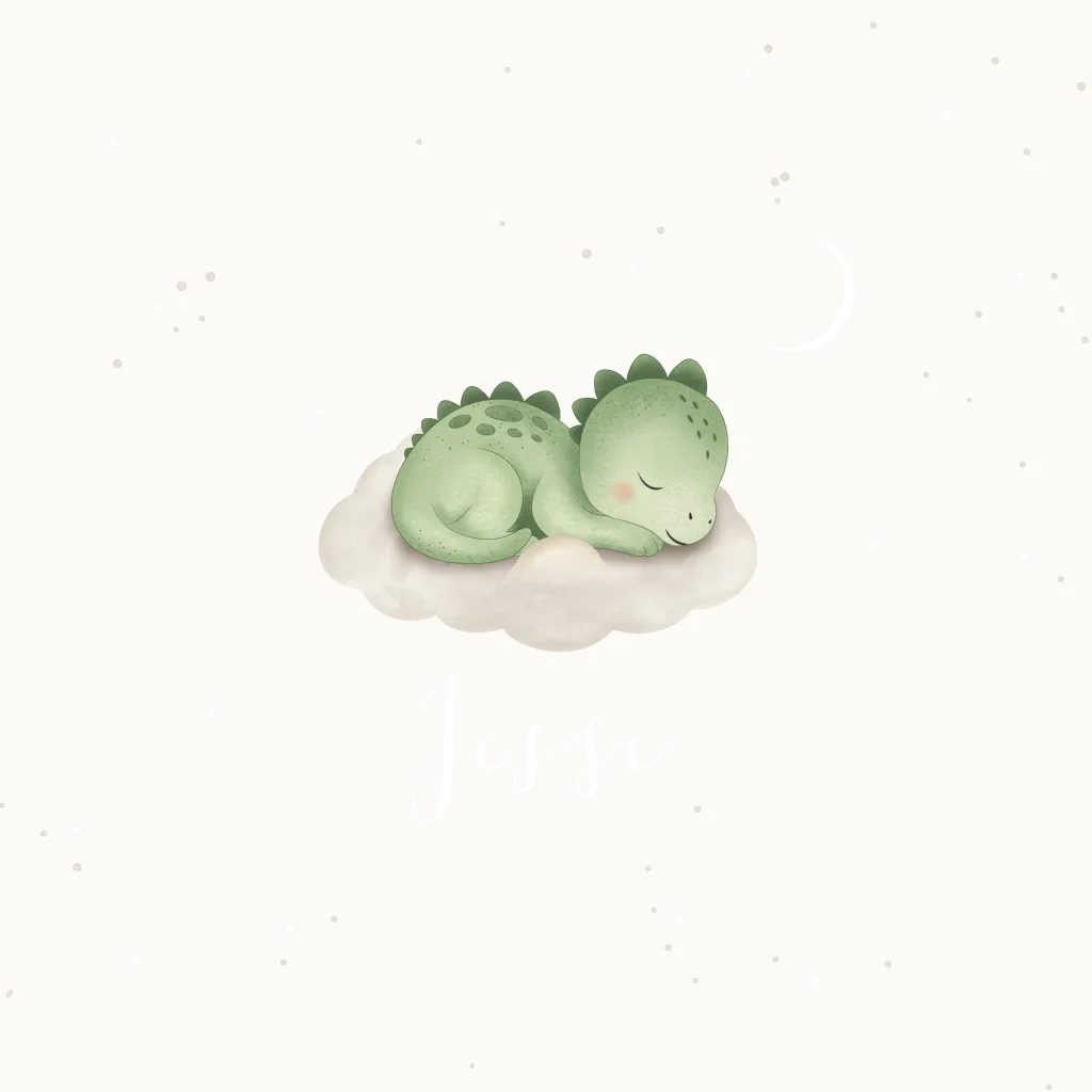 Een lief geboortekaartje met prachtig goudfolie. Het kaartje heeft een lieve illustratie van een dino op een dromerig wolkje. Het maandje en de naam wordt gedrukt in goudfolie. Pas het ontwerp naar wens aan in onze online editor.