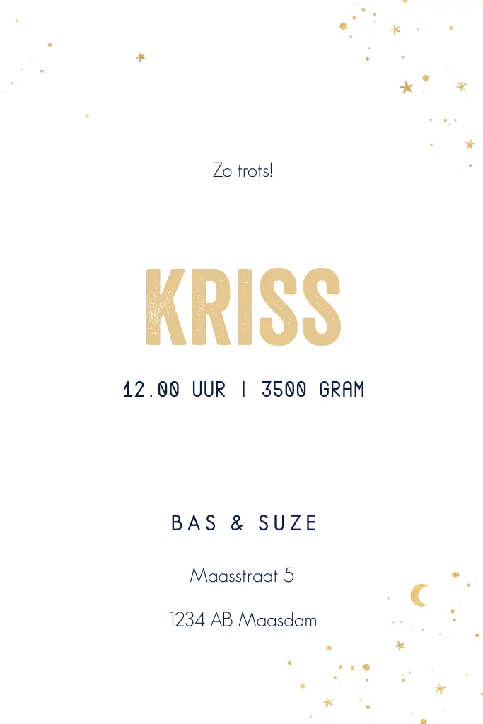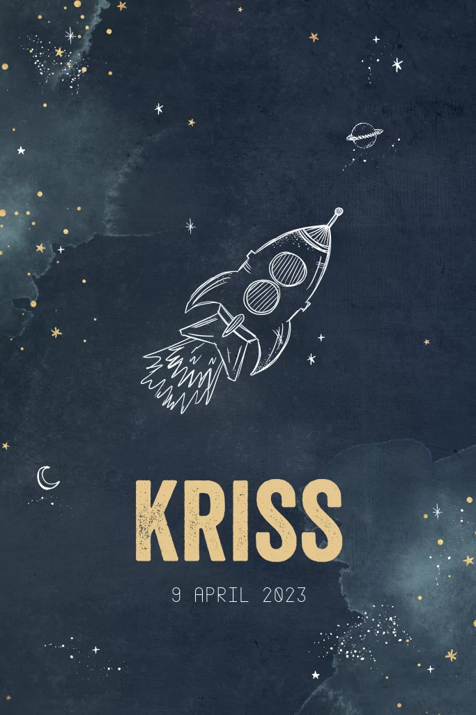 Bij de geboorte van jullie kleine bink, hoort een stoer geboortekaartje. Wat dacht je van dit kaartje met raket in de sterrenhemel?