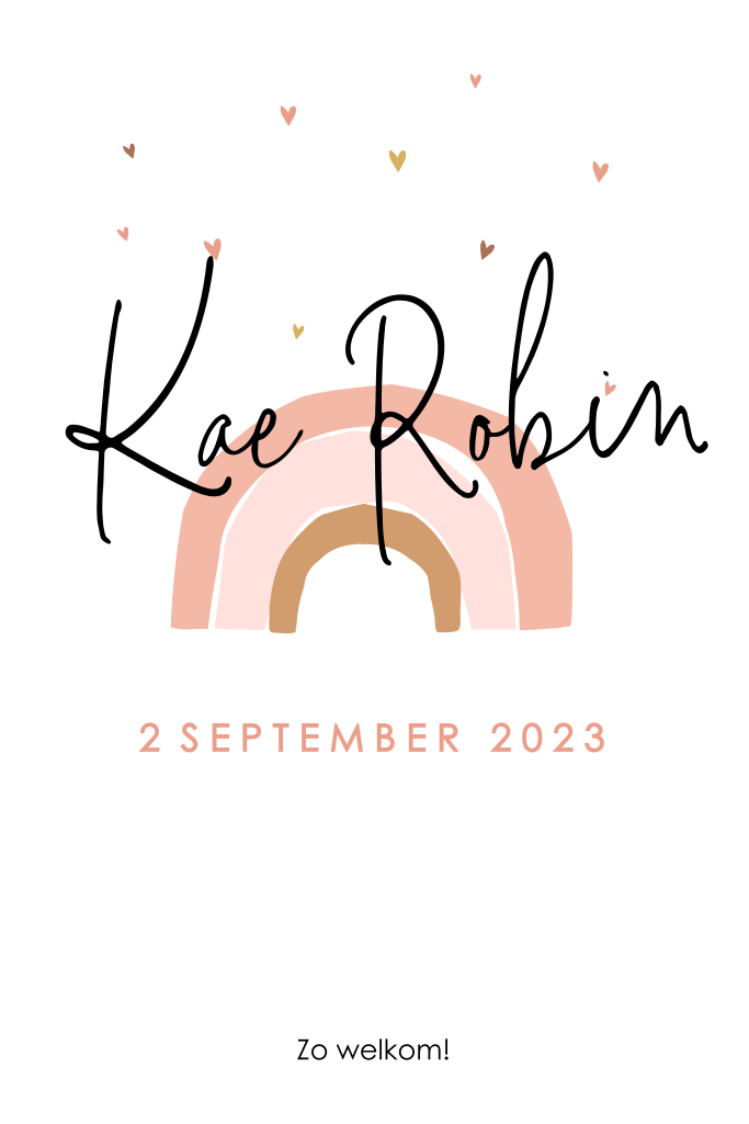 Lief en trend geboortekaartje meisje regenboog in de kleuren peach. Daaromheen kleine hartjes en de naam speels geplaatst op de regenboog. Kies bijvoorbeeld voor de papiersoort parelmoer met een peach envelop.