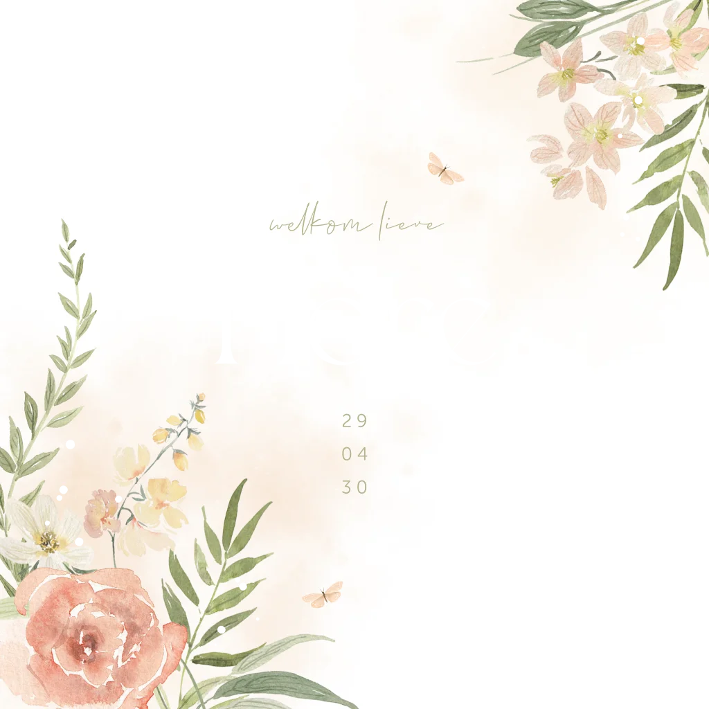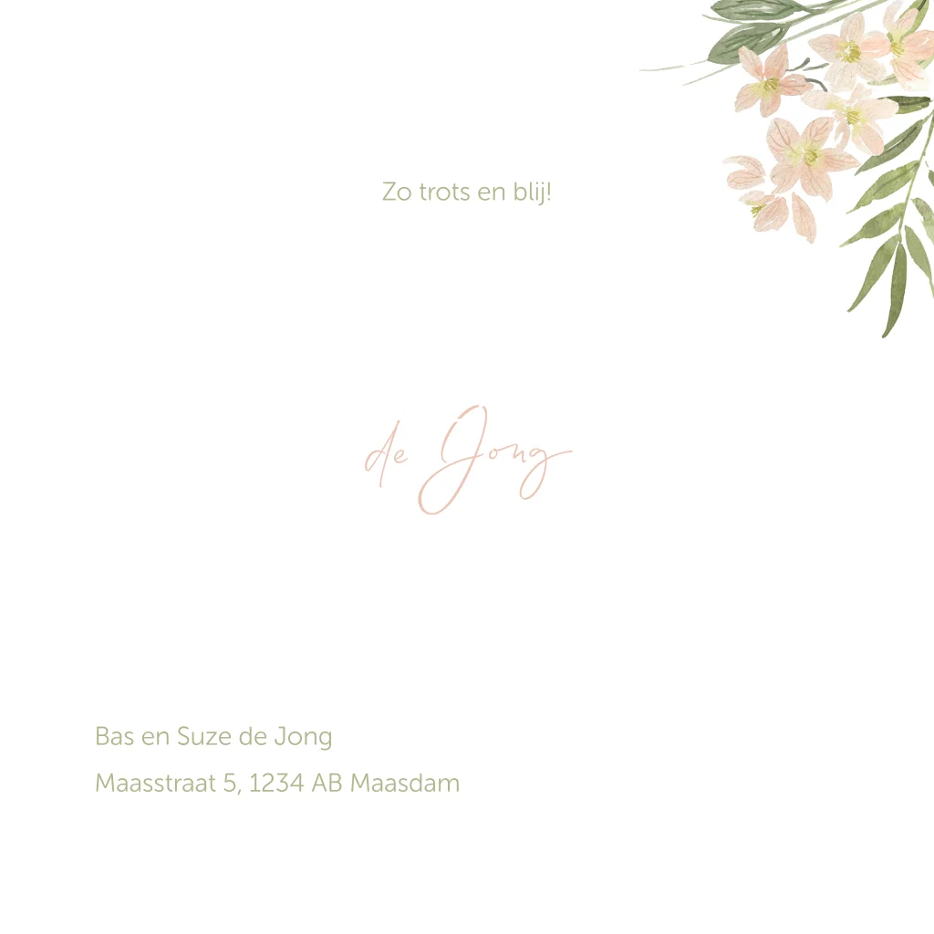 Romantisch geboortekaartje meisje met aquarel bloemen en goudfolie