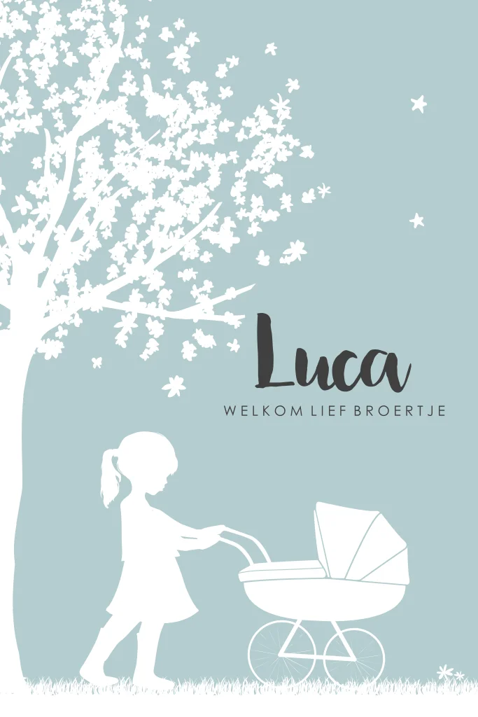 Lief en hip geboortekaart jongetje met silhouetje van meisje met wandelwagen. Maak zelf het verhaal van jullie gezin door silhouetjes te plaatsen op dit babykaartje.