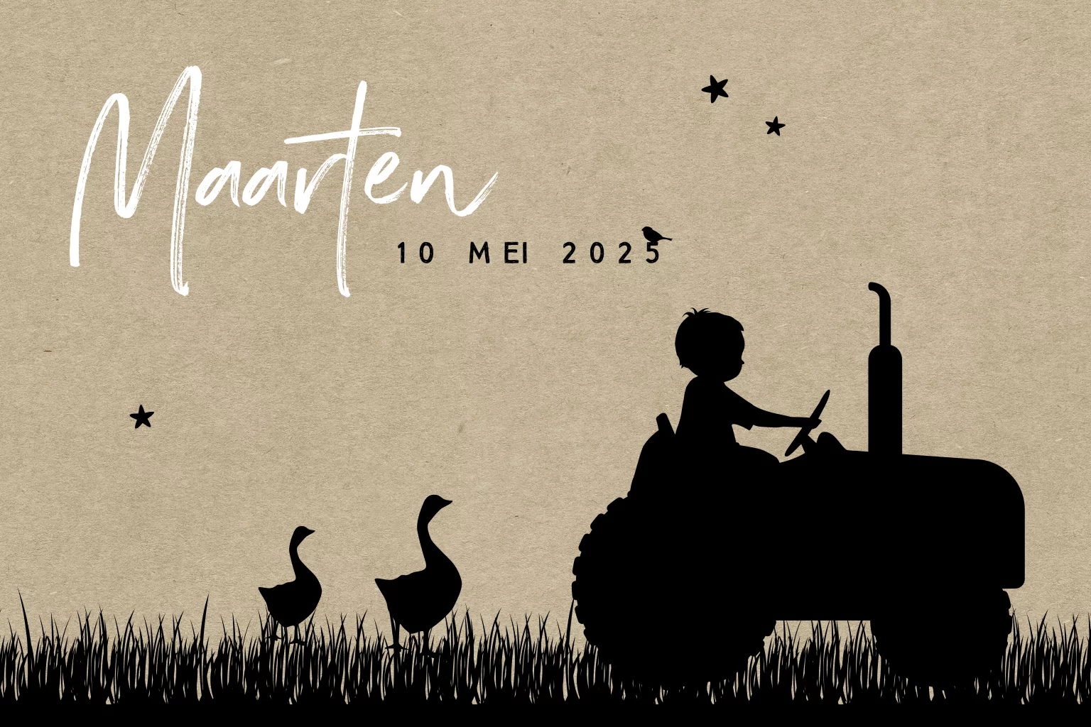 Een hip babykaartje zoon met tractor. Een kaartje in boerderij stijl wat ook op maat door ons is aan te passen. Zo kunnen we samen met jou een uniek kaartje op maat maken.