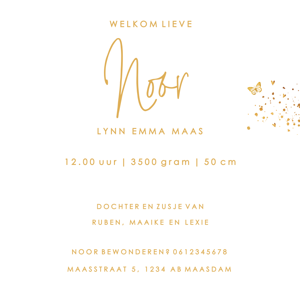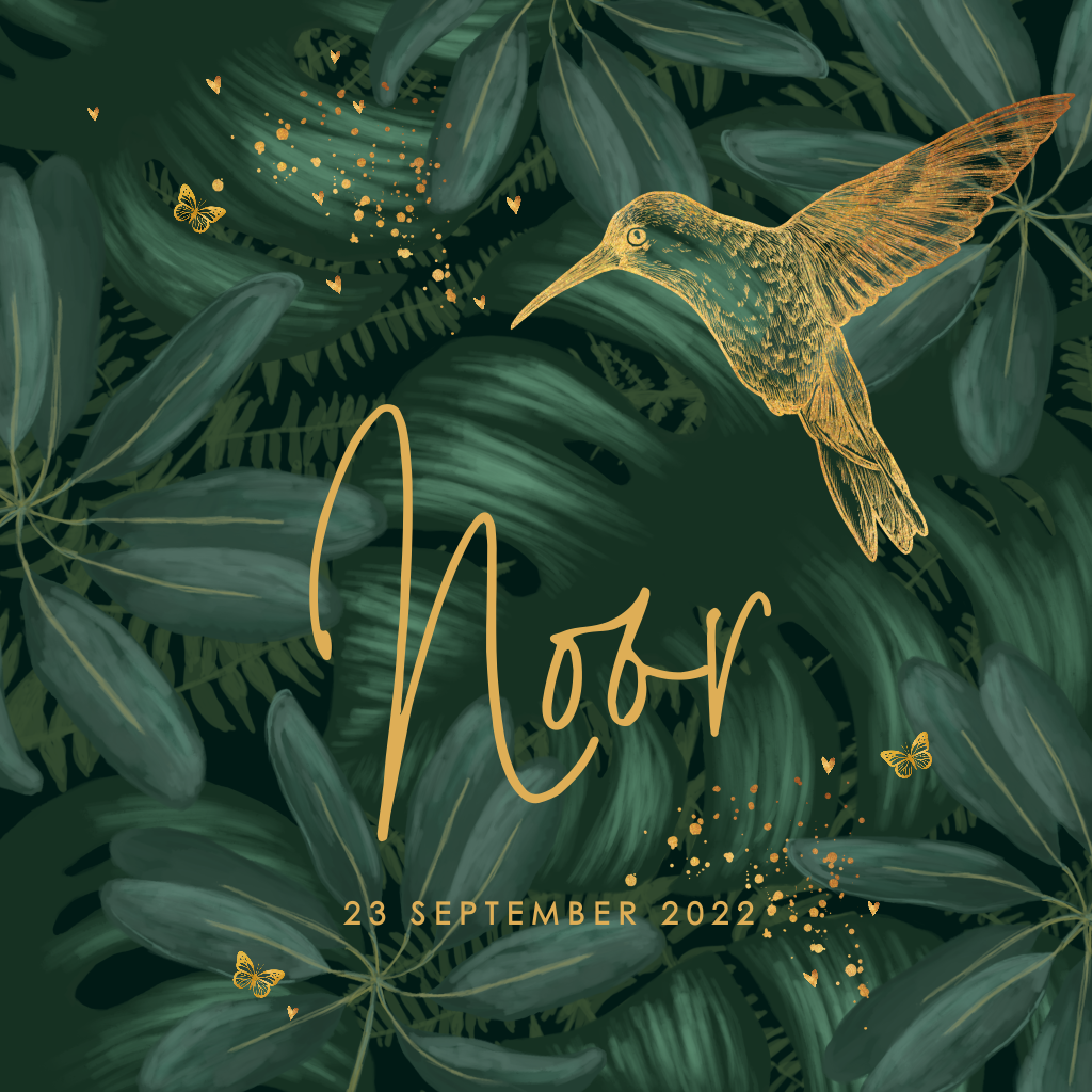 Prachtig en avontuurlijk kaartje geboorte meisje met een illustratie van een kolibrie in goudlook. Een donkergroene jungle achtergrond met wat spetters, een vlinder en kleine hartjes in goudlook. Pas eenvoudig tekst en kleur aan en maak een proefdruk.
