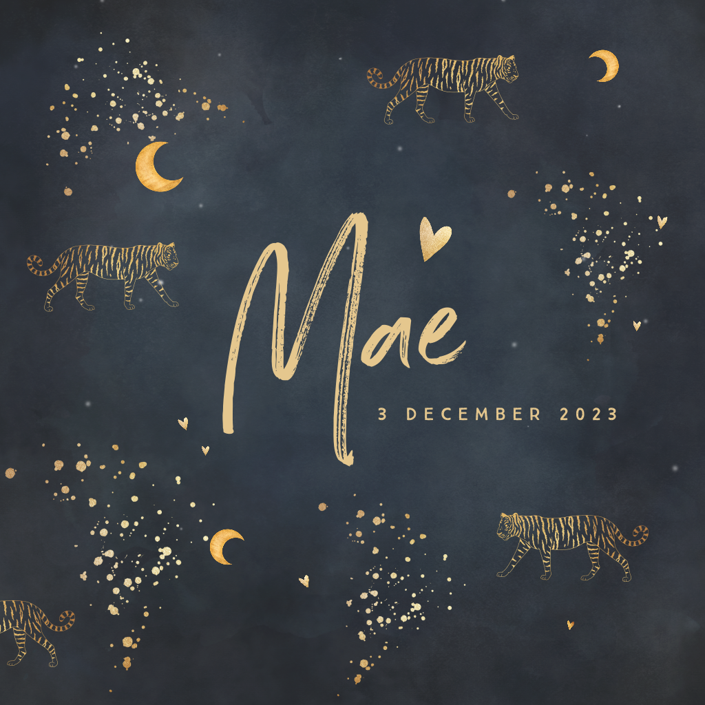 Stoer geboortekaartje meisje met tijger maan en sterren