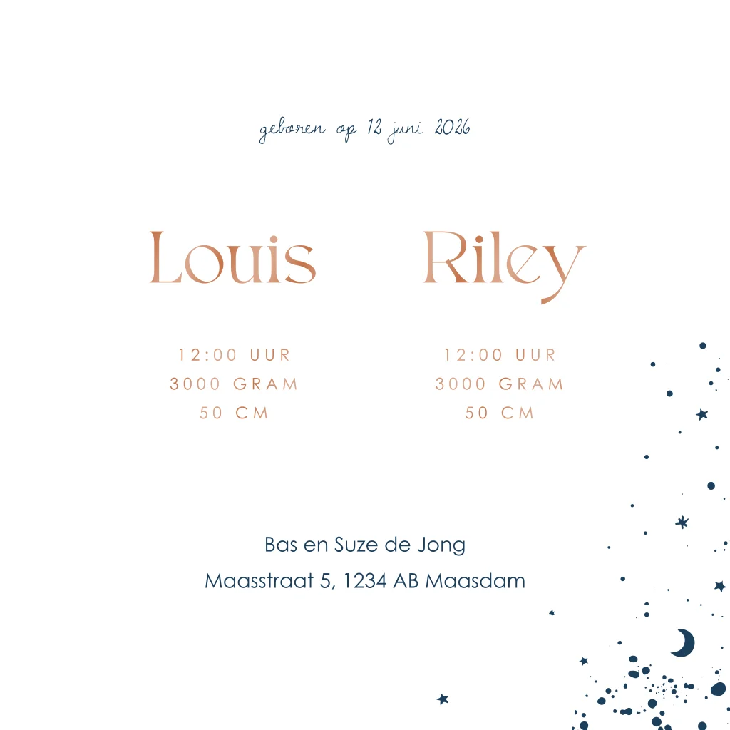 Stoer geboortekaartje tweeling met sterretjes en maantjes