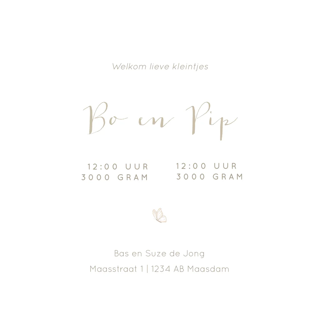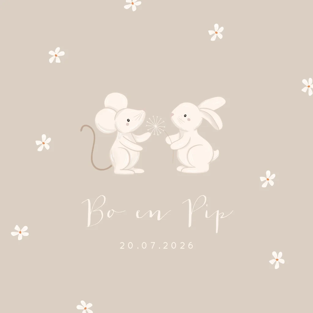 Superlief geboortekaartje om de geboorte van jullie tweeling aan te kondigen! Op de pastel beige achtergrond met witte bloemetjes staan een lief muisje en konijntje boven de namen in hippe letters, deze pas je gemakkelijk zelf aan in de editor.